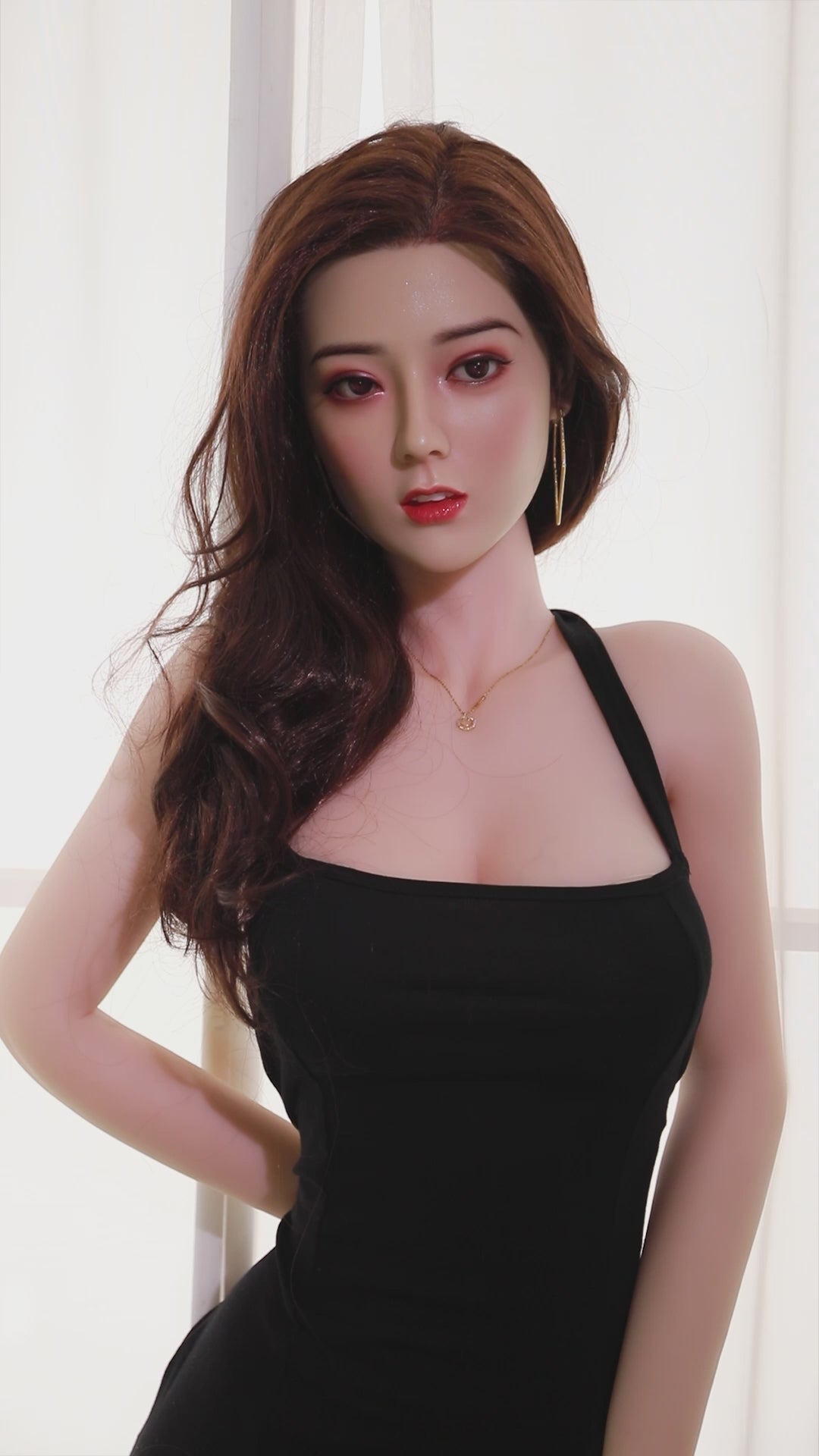Step into elegance with our stunning 158cm small sex dolls – a premium tpe dolls full body life size with head sex combined with realistic sex toy body design. This sophisticated brunette beauty poses confidently in a sexy black halter dress with high side slit, black high heels, and delicate necklace, showcasing her flowing wavy hair, captivating eyes, full breasts, slim waist, curvaceous hips, and long toned legs against a bright window backdrop.